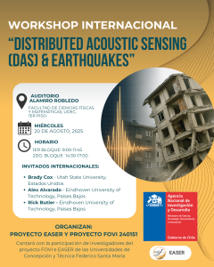El próximo 20 de agosto de 2025, el Proyecto EASER realizará el Workshop Internacional “Distributed Acoustic Sensing (DAS) & Earthquakes”, en el Auditorio Alamiro Robledo de la Facultad de Ciencias Físicas y Matemáticas de la Universidad de Concepción (primer piso). El workshop Internacional reunirá a destacados especialistas internacionales para abordar